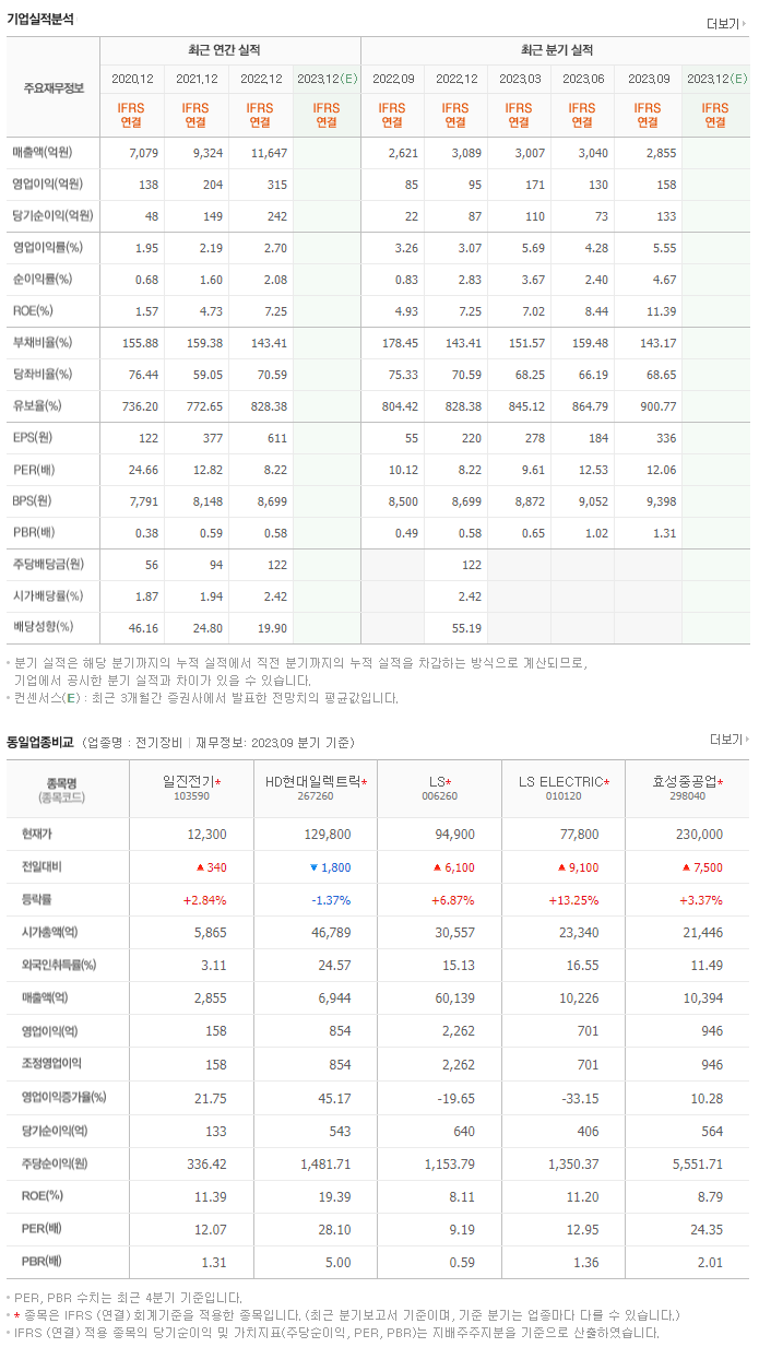 -2023년 9월 전년동기 대비 연결기준 매출액은 4% 증가, 영업이익은 108.8% 증가, 당기순이익은 104.4% 증가. 신제품 개발을 통한 안정적인 영업기반을 지속적으로 유지하며 해외시장 다변화 전략을 추진함으로써 지속적으로 수주를 유치하고 있음. 글로벌 경기침체에 따른 설비투자 회복 지연 및 수요산업 부진 등 경기 하방 리스크가 있으나, 글로벌 전력 수요는 상승할 것으로 전망하고 있음.