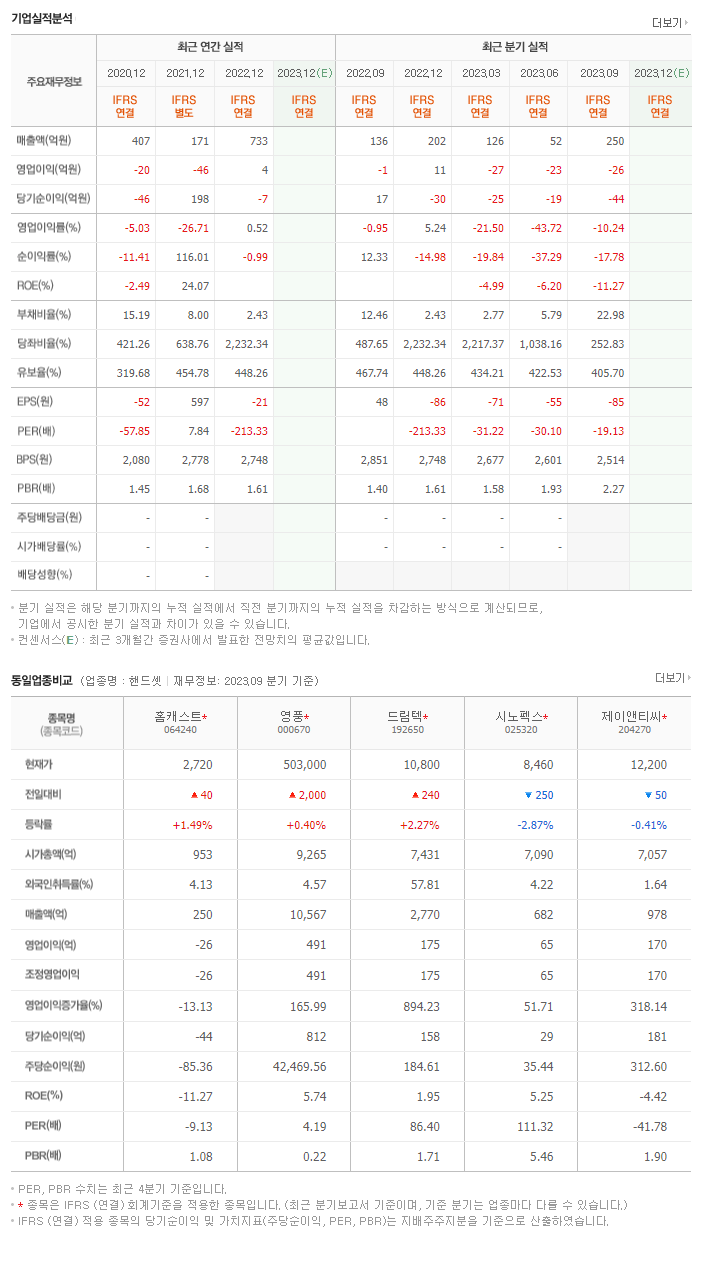 -2023년 9월 전년동기 대비 연결기준 매출액은 19.5% 감소, 영업손실은 1,005.9% 증가, 당기순이익 적자전환. 화장품 사업부를 신규로 편입하였으며, 지난 분기 대비 매출이 약 50%가량 상승하였음. 하지만 지속적으로 영업손실이 발생되고 있음. 화장품을 사업부문으로 하는 씨에스에이코스믹의 지분을 취득하여 종속회사로 편입하였음. 이외에도 시장경쟁력 강화를 위해 셋톱박스 사업부를 양수할 예정임.