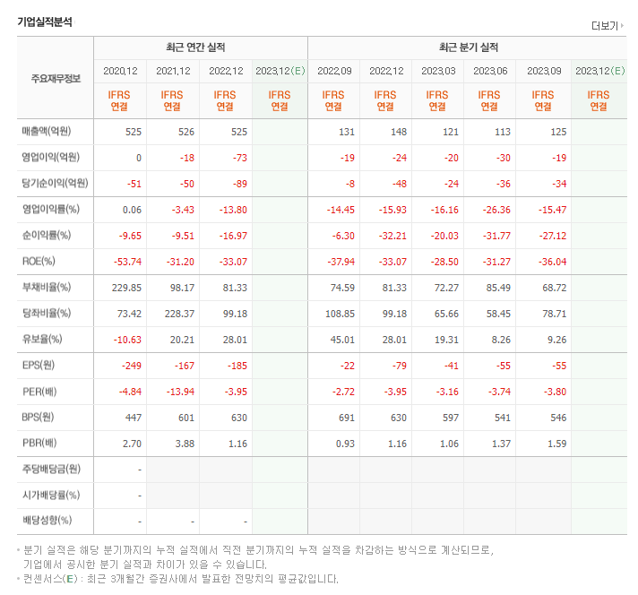 -2023년 9월 전년동기 대비 연결기준 매출액은 5% 감소, 영업손실은 40% 증가, 당기순손실은 88.1% 증가. 판매관리비와 금융비용의 증가로 인해 적자폭 확대. 10월 25일 170억 규모의 유상증자결정했으며, 해당 유상증자로 최대주주는 (주)글로우웨일에서 한국제약기술가치펀드조합으로 변경될 예정. 운영자금 목적으로 10월 18일 53억규모의 단기차입금 증가를 결정.