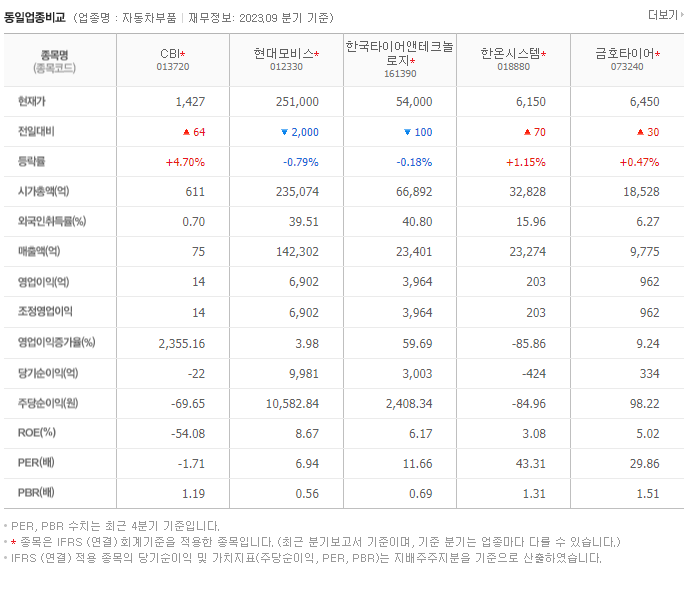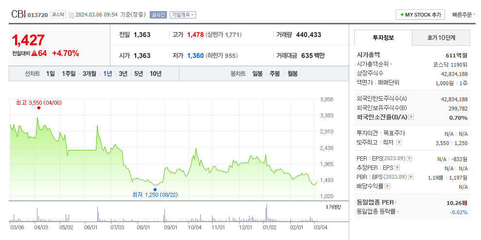 CBI 현재 주가는 1,333원이며 전일 대비 -32원의 모습을 보이고 있습니다. CBI의 주주현황을 살펴보면 그로우스앤밸류13호투자조합 주주가 전체 지분 7.83%를 소유하고 있습니다. CBI는 자동차부품 기업으로 장중 기준으로 주가는 1,333원 입니다. CBI의 시가 총액은 584억 원이며 발행 주식수는 42,834,188주 입니다. 외국인 보유 비중은 0.70% 이며 장중 거래량은 232,992원 을 기록했습니다. 매출액은 240억 원을 달성했습니다. EPS는 없음원이며 CBI 주식 배당수익률은 1% 입니다.