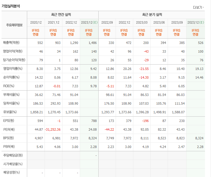 -2023년 9월 전년동기 대비 연결기준 매출액은 19.7% 증가, 영업이익은 54.5% 감소, 당기순이익은 17.8% 감소. 매출액은 증가하였으나, 매출원가와 판관비가 13.1%, 43.9% 증가하면서 영업이익이 대폭 감소함. 판관비 중 대부분의 비용이 증가했지만, 특히 인건비 및 복리후생비가 37.6% 증가, 광고선전비가 232.20% 증가하며 수익성에 악영향을 줌.