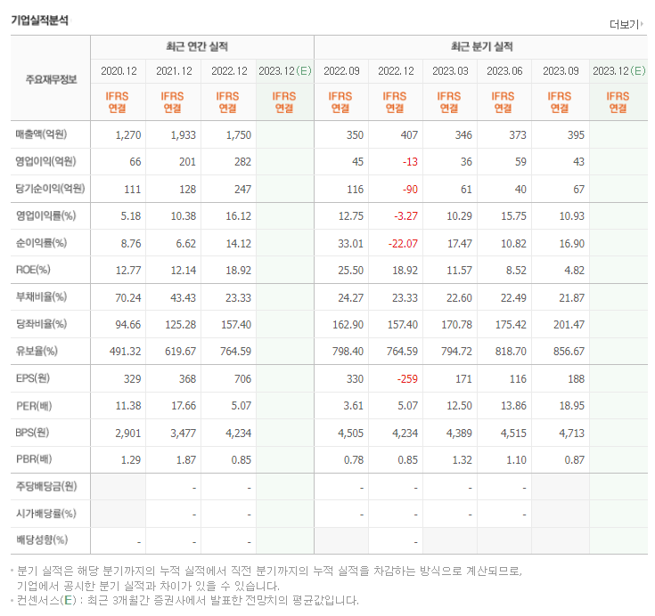 -전세계적인 긴축 기조와 함께 지난해 하반기부터 반도체 수요가 위축되면서 2023년 3분기 누적 동사의 매출액과 영업이익 모두 크게 감소함. 올 하반기 들어 5세대 사물인터넷(IoT)과 함께 자동차 텔레메틱스(전장) 부문을 중심으로 메모리반도체 수요가 증가하면서 매출액 증가 흐름이 이어지고 있음. 최근 반도체 가격도 반등하면서 4분기와 내년 실적이 더욱 개선될 수 있을 것으로 기대됨.