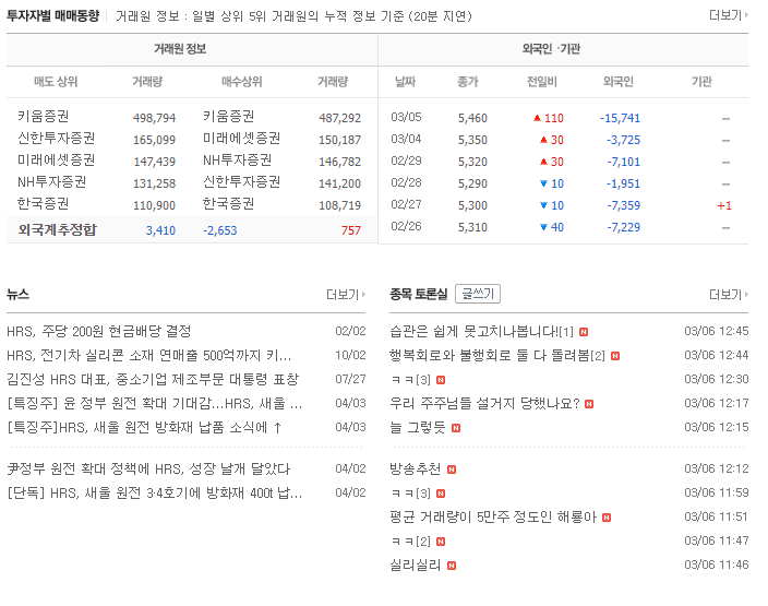 HRS 현재 주가는 5,460원이며 전일 대비 -1.27원의 모습을 보이고 있습니다. HRS의 주주현황을 살펴보면 강성자 주주가 전체 지분 45.04%를 소유하고 있습니다. HRS는 화학 기업으로 장중 기준으로 주가는 5,460원 입니다. HRS의 시가 총액은 922억 원이며 발행 주식수는 16,354,800주 입니다. 외국인 보유 비중은 1.41% 이며 장중 거래량은 188,642원 을 기록했습니다. 매출액은 588억 원을 달성했습니다. EPS는 없음원이며 HRS 주식 배당수익률은 % 입니다.