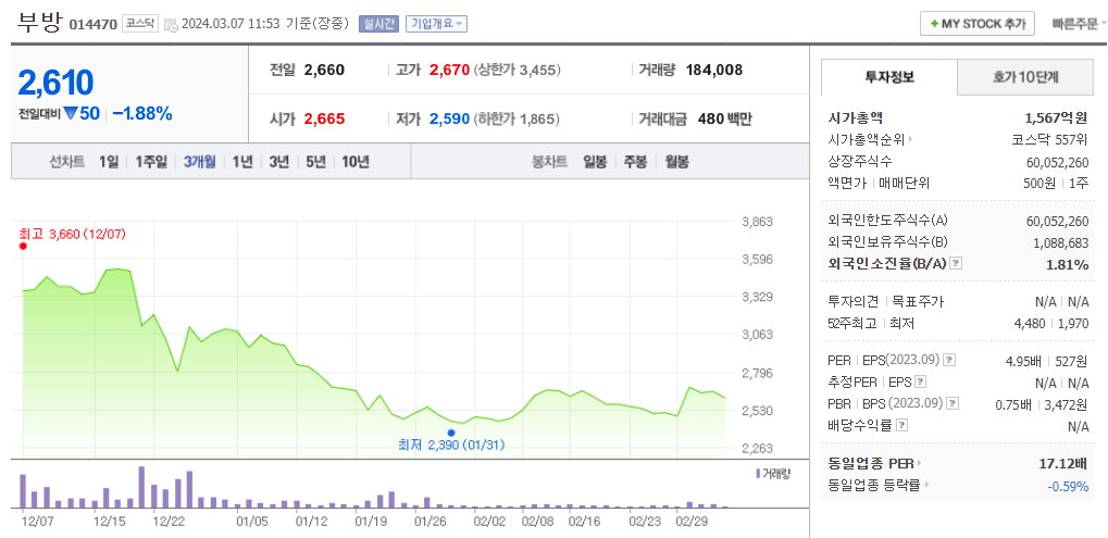 이 글에서는 부방 주가 전망과 목표 주가, 기업 정보에 대해서 설명합니다. 주식 투자의 핵심은 현재의 기업 가치보다는 미래의 가치를 예측하며 먼저 대응하는 것입니다. 투자 대상을 결정하기 위해 먼저 현재 기업 상태와 수치를 검토해야 합니다. 부방 주식의 주요 현황과 투자 정보를 확인하시고 주식 투자를 고민하고 계시다면 유용한 정보들을 모아 놓은 자료를 확인해보세요..