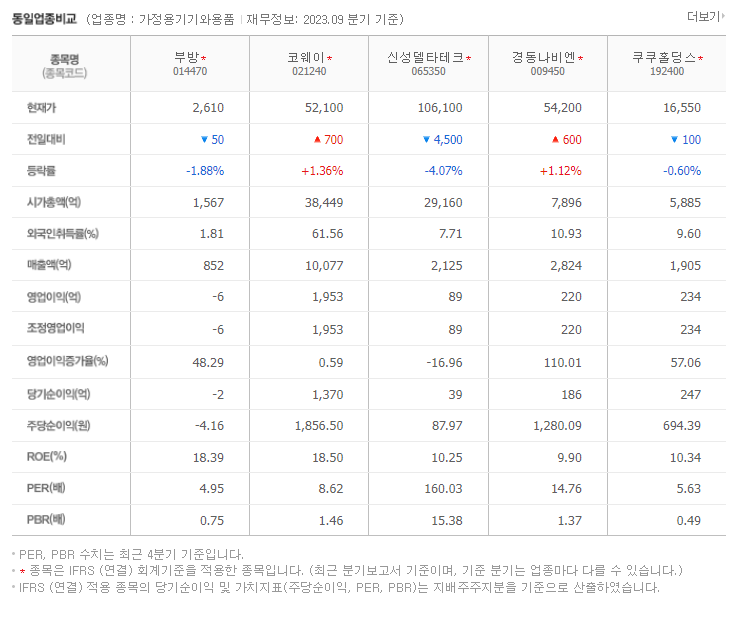 -2023년 9월 전년동기 대비 연결기준 매출액은 6.8% 감소, 영업이익 적자전환, 당기순이익은 30.2% 증가. 국내 및 해외 밥솥 판매량이 부진해지면서 동사의 실적이 감소하여 블렌더, 음식물처리기, 식기세척기, 가습기 등으로 제품을 다각화하여 매출확대에 노력하고 있음. 쿠첸은 2023년에는 4분할 FLEX와 우측 듀얼 원형 화구로 구성된 프리미엄 인덕션을 출시하여 라인업을 확대.