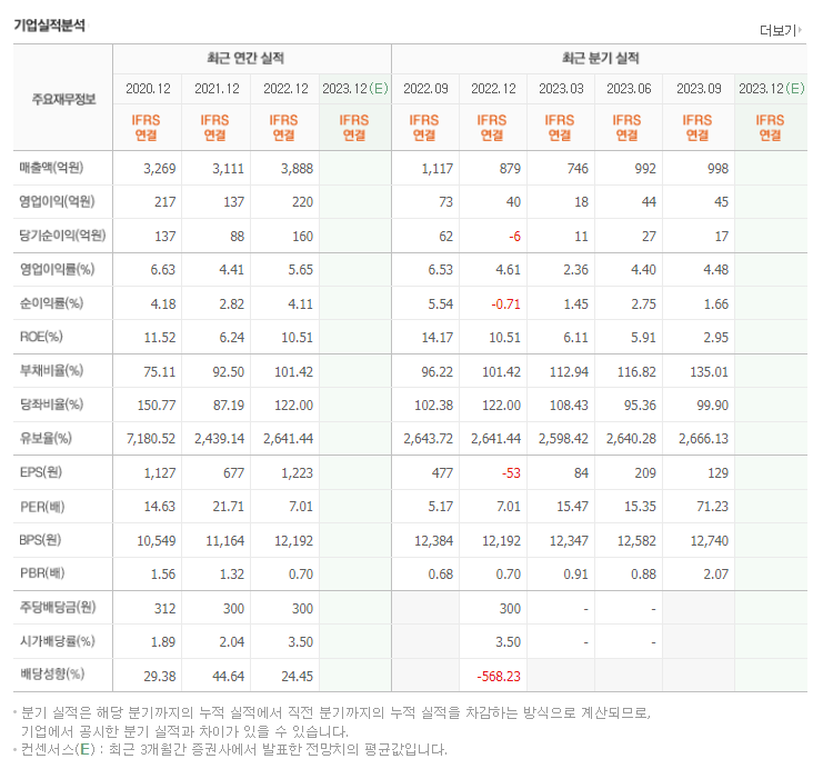 -2023년 9월 전년동기 대비 연결기준 매출액은 9.1% 감소, 영업이익은 40.8% 감소, 당기순이익은 66.9% 감소. 클린룸산업 부문(산업용 클린룸,드라이룸,바이오클린룸)의 국내 매출액이 감소하여 수익성이 하락함. 2023년 4분기 내 물류센터 시공을 위한 공사발주를 계획하고 있으며, 이를 통한 본격적인 자금투입 매출발생은 내년부터 이루어질 것으로 예상됨.
