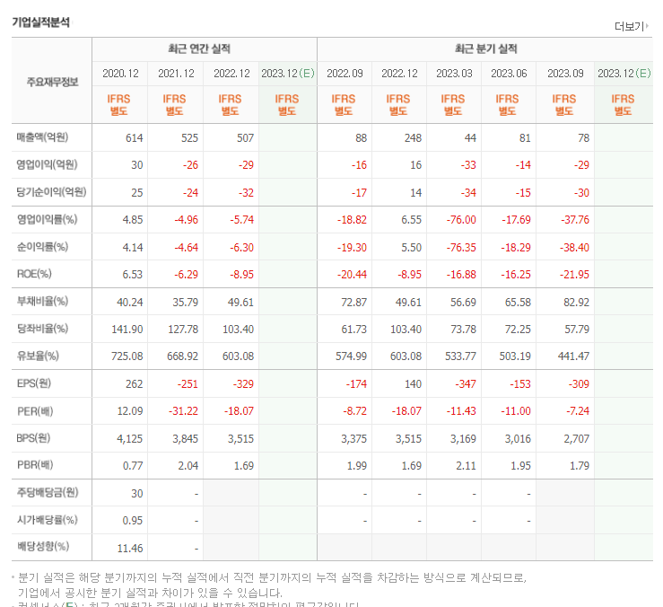 -2023년 9월 전년동기 대비 별도기준 매출액은 21.7% 감소, 영업손실은 70.4% 증가, 당기순손실은 72.1% 증가. 매출액 감소에 비해 매출원가가 소폭 감소해 수익성에 악영향을 줌. 특히 판매와관리비 중 가장 큰 비중을 차지하는 급여가 오히려 4.5% 상승하며 부담을 가중시킴. 금융원가가 전년동기 대비 123.32% 증가하며 당기순손실 증가에 영향을 줌.