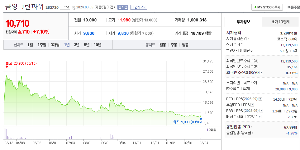 금양그린파워 현재 주가는 10,000원이며 전일 대비 -260원의 모습을 보이고 있습니다. 금양그린파워의 주주현황을 살펴보면 이윤철 주주가 전체 지분 59.81%를 소유하고 있습니다. 금양그린파워는 에너지 시설 및 서비스 기업으로 장중 기준으로 주가는 10,000원 입니다. 금양그린파워의 시가 총액은 1298억 원이며 발행 주식수는 12,119,500주 입니다. 외국인 보유 비중은 0.37% 이며 장중 거래량은 35,675원 을 기록했습니다. 매출액은 1,611억 원을 달성했습니다. EPS는 없음원이며 금양그린파워 주식 배당수익률은 -50% 입니다.