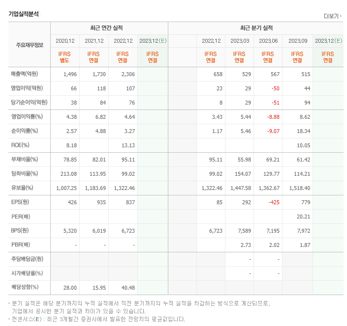 -2023년 9월 전년동기 대비 연결기준 매출액은 2.3% 감소, 영업이익은 73.1% 감소, 당기순이익은 5.8% 증가. 핵심 사업인 플랜트 전기공사 사업 부분의 해외 매출이 전년동기 대비 감소하였으나, 신재생에너지 부분의 매출이 크게 성장하며 지난분기 영업손실을 회복함. 국내 신재생에너지 발전 플랜트 EPC 시장의 초기 진입자로서 입지를 공고히 하고, 향후 지속적으로 신재생에너지 EPC 수주 포트폴리오를 확대할 계획임.