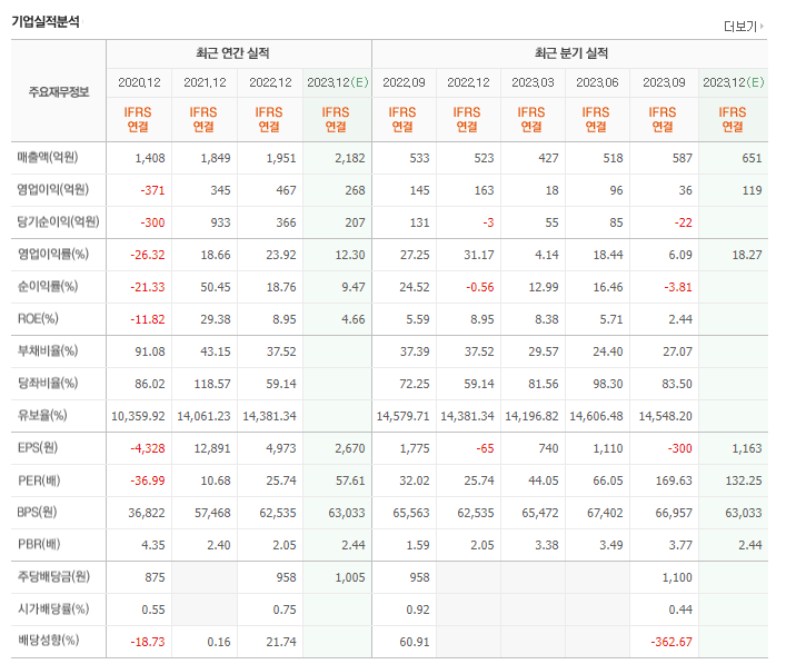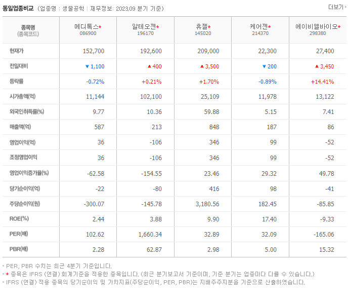 -2023년 9월 전년동기 대비 연결기준 매출액은 7.2% 증가, 영업이익은 51% 감소, 당기순이익은 68.5% 감소. 동사의 매출은 증가했으나 소송 관련 비용으로 인해 영업이익이 감소함. 지배기업은 대전지방식품의약품안전청과의 메디톡신주(50단위, 100단위, 150단위)에 대한 품목허가 취소 처분 및 잠정제조판매중지명령 처분에 대한 취소소송에 대하여 2023년 11월 9일 1심판결에서 승소.