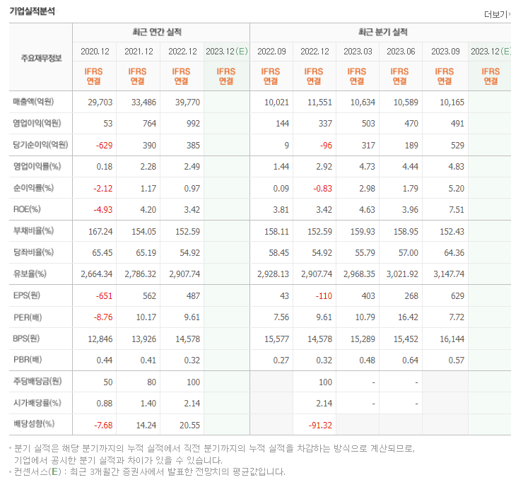-2023년 9월 전년동기 대비 연결기준 매출액은 11.2% 증가, 영업이익은 123.8% 증가, 당기순이익은 118.1% 증가. 코로나19 사태로 인해 악화되었던 전방산업이 점차 상승 흐름을 나타낸 영향으로 동사의 매출 확대되었으며, 원가율 하락 및 비용부담 감소 영향으로 수익성 또한 크게 상승. 하이브리드 및 연료전지차의 차체부품 및 차량 경량화에 대한 지속적인 연구 개발 및 특허를 통해 향후 신규시장 선점을 위한 노력중.