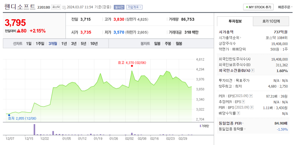 핸디소프트 현재 주가는 3,715원이며 전일 대비 -160원의 모습을 보이고 있습니다. 핸디소프트의 주주현황을 살펴보면 오상 주주가 전체 지분 47.62%를 소유하고 있습니다. 핸디소프트는 일반 소프트웨어 기업으로 장중 기준으로 주가는 3,715원 입니다. 핸디소프트의 시가 총액은 738억 원이며 발행 주식수는 19,408,000주 입니다. 외국인 보유 비중은 1.60% 이며 장중 거래량은 89,851원 을 기록했습니다. 매출액은 163억 원을 달성했습니다. EPS는 없음원이며 핸디소프트 주식 배당수익률은 % 입니다.