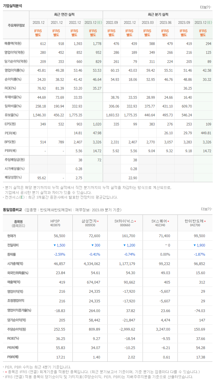 HPSP는 반도체 및 관련장비 기업입니다. 대표자는 김용운 이며 설립일은 2017/03/14, 주식 상장일은 2022/07/15입니다. 전체 종업원 수는98명 이고 본사 주소는 경기도 수원시 권선구 오목천로152번길 65입니다.