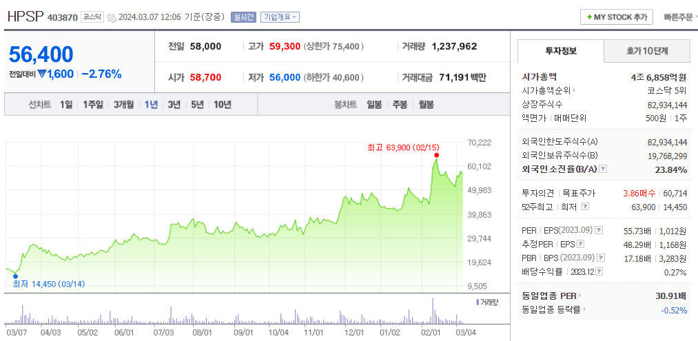 HPSP 현재 주가는 58,000원이며 전일 대비 원의 모습을 보이고 있습니다. HPSP의 주주현황을 살펴보면 프레스토제6호사모투자합자회사 주주가 전체 지분 39.55%를 소유하고 있습니다. HPSP는 반도체 및 관련장비 기업으로 장중 기준으로 주가는 58,000원 입니다. HPSP의 시가 총액은 4조7190억 원이며 발행 주식수는 82,934,144주 입니다. 외국인 보유 비중은 23.84% 이며 장중 거래량은 2,182,956원 을 기록했습니다. 매출액은 1,486억 원을 달성했습니다. EPS는 1,167원이며 HPSP 주식 배당수익률은 0.28% 입니다.