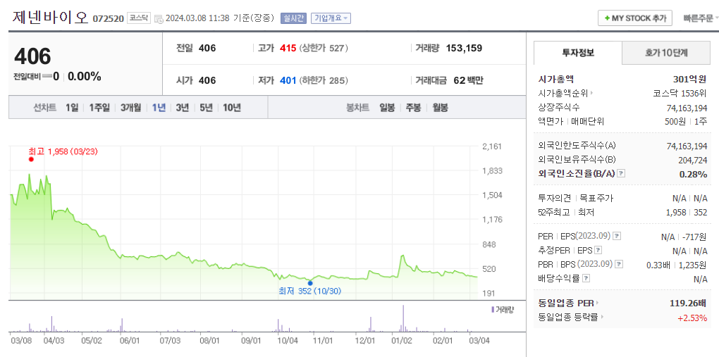 이 글에서는 제넨바이오 주가 전망과 목표 주가, 기업 정보에 대해서 설명합니다. 주식 시장에서 중요한 것은 미래의 기업 가치를 예측하고 선제적으로 움직이는 것입니다. 투자할 종목을 고르기 전에 현재 기업의 현황과 데이터를 확인하는 것이 필요합니다. 제넨바이오 주식의 주요 현황과 투자 정보를 확인하시고 주식 투자에 도움을 줄 자료들을 모아두었으니 참고하여 효율적인 투자를 해보세요.