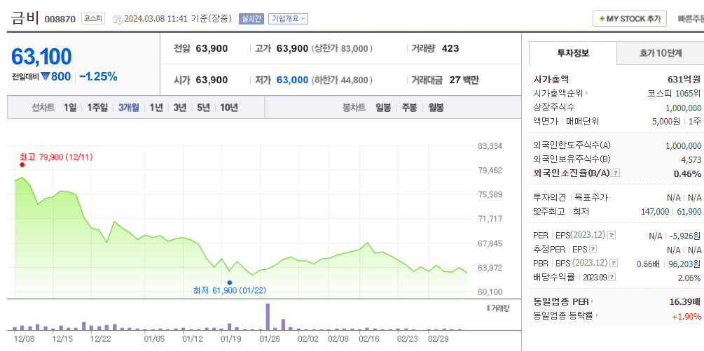 금비 현재 주가는 63,900원이며 전일 대비 -2.14원의 모습을 보이고 있습니다. 금비의 주주현황을 살펴보면 고기영 주주가 전체 지분 56.87%를 소유하고 있습니다. 금비는 용기 및 포장 기업으로 장중 기준으로 주가는 63,900원 입니다. 금비의 시가 총액은 632억 원이며 발행 주식수는 1,000,000주 입니다. 외국인 보유 비중은 0.46% 이며 장중 거래량은 1,083원 을 기록했습니다. 매출액은 622억 원을 달성했습니다. EPS는 없음원이며 금비 주식 배당수익률은 -3.97% 입니다.