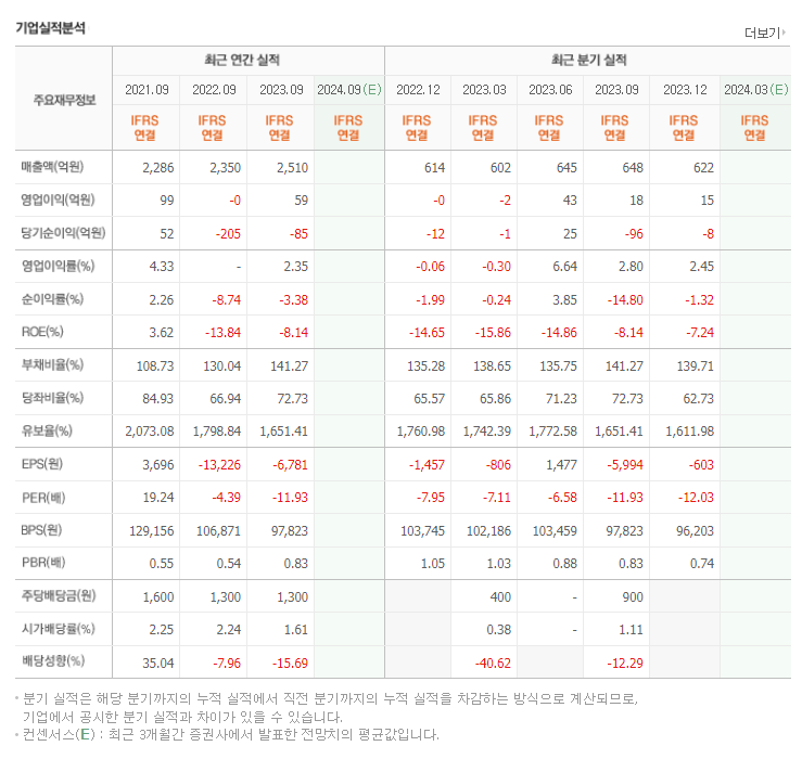 -2023년 9월 전년동기 대비 연결기준 매출액은 6.8% 증가, 영업이익 흑자전환, 당기순손실은 48.7% 감소. 전년동기대비 매출액이 증가하며 영업이익이 개선되었으나 금융비용 및 기타영업외비용 증가로 당기순이익은 적자에 그침. 유리병 산업은 전반적으로 주류 및 식음료 산업의 경기와 일정한 관계를 가지고 있으며, 이에 따라 경기변동과 함께 계절적인 요인도 영향을 미치고 있음.