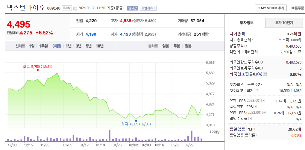 이 글에서는 넥스턴바이오 주가 전망과 목표 주가, 기업 정보에 대해서 설명합니다. 주식 투자에서 핵심은 미래의 기업 가치를 예상하고 선제적으로 움직이는 것입니다. 투자 대상을 결정하기 전에 현재 기업의 현황과 수치를 검토하는 것이 필요합니다. 넥스턴바이오 주식의 주요 현황과 투자 정보를 확인하시고 주식 투자에 도움이 될 만한 정보들을 모아 놓았으니 투자를 고려하실 때 참고하세요.